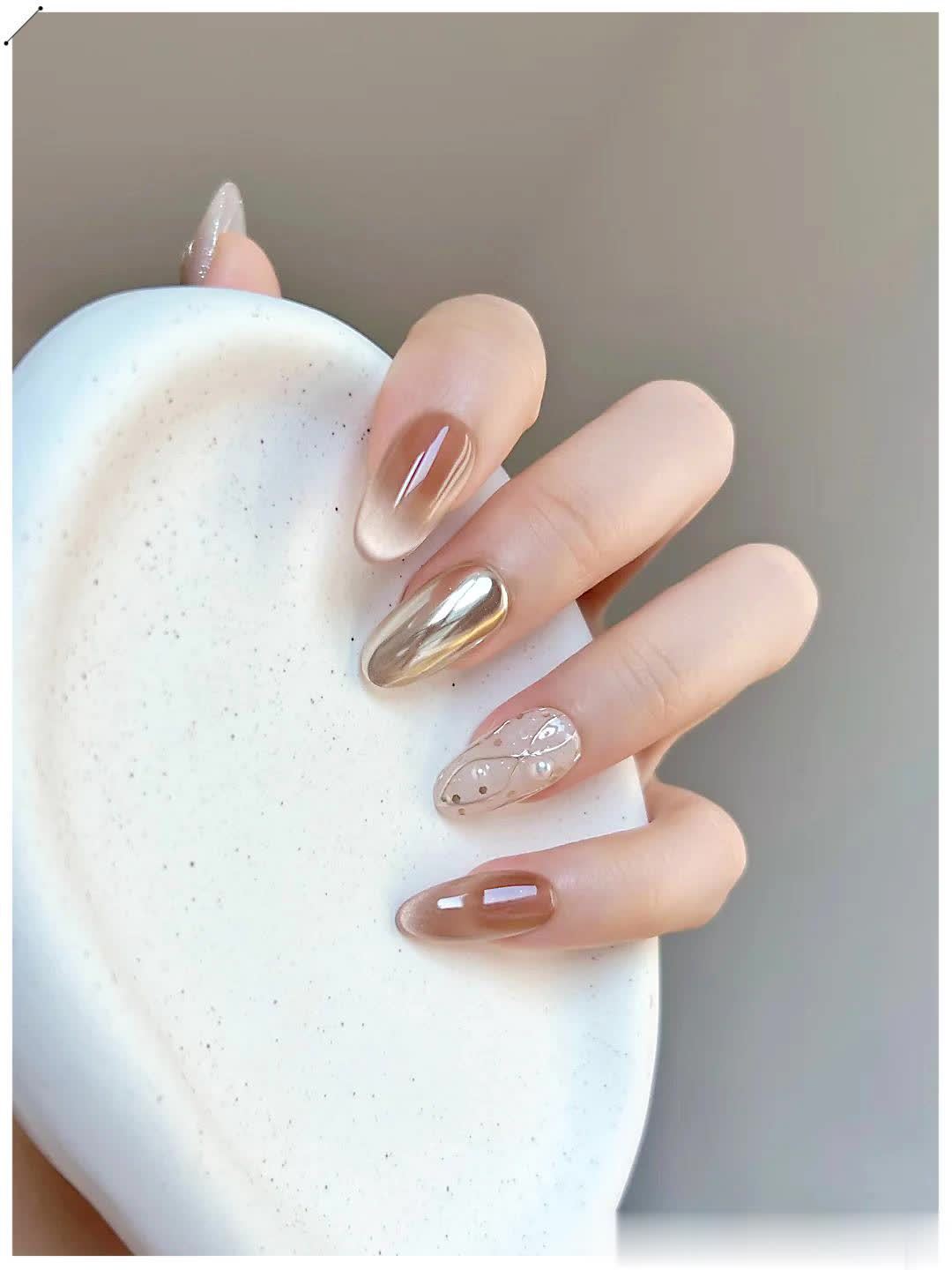 黄皮姐妹重点冲低饱和裸色、茶咖色、冰灰调,显白又柔和,完全不挑皮;白皮姐妹做浅粉、奶白、清透细闪,更是清冷又灵气。短甲选简约小设计,利落显精致;长甲做猫眼 + 碎钻,气场直接拉满。这 10 款都是近期实穿度极高的爆款,好做不贵、不易翻车,完全是闭眼做都不会出错的类型。